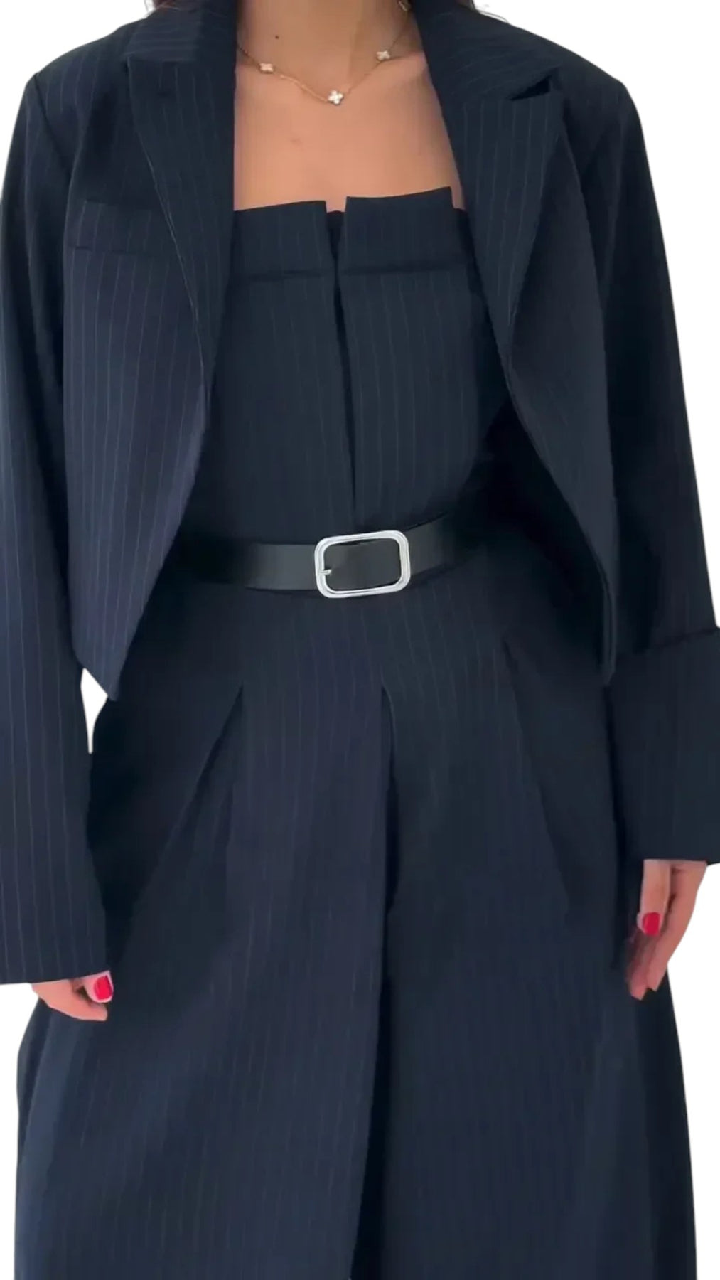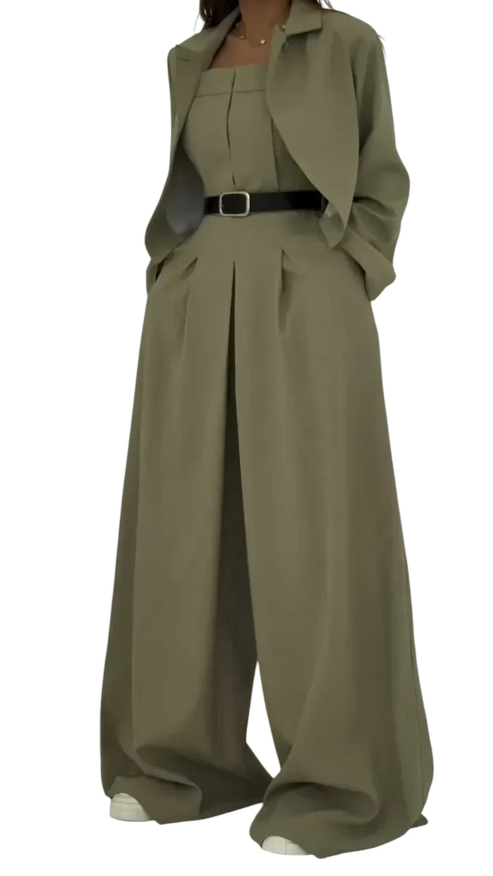 Con un pantalón amplio y moderno, un bustier estructurado y una chaqueta fluida a juego, está diseñado para favorecer todas las siluetas y resaltar tu elegancia natural.