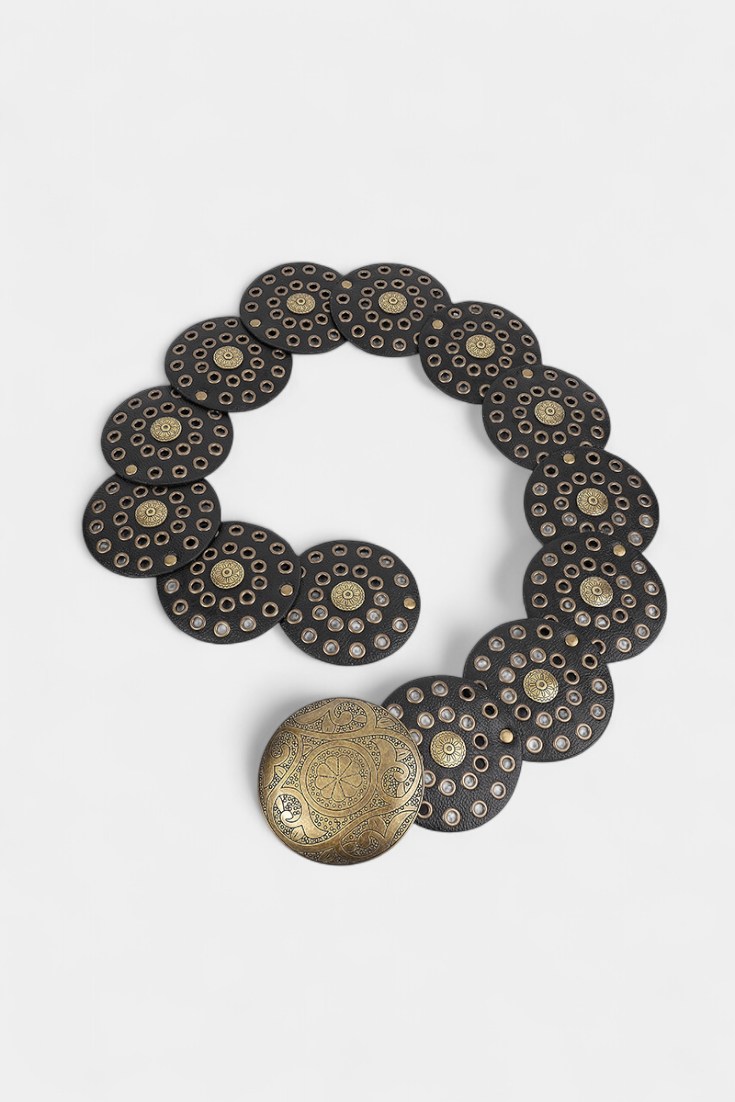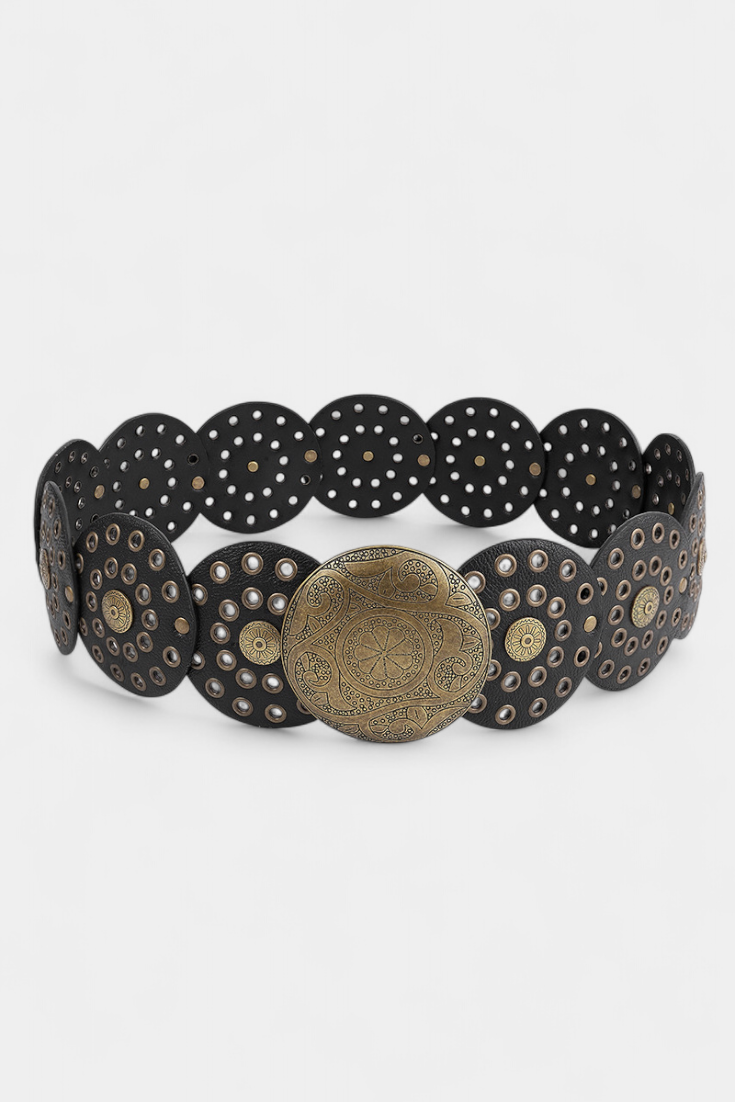 Un accesorio audaz que combina el estilo western con un aire bohemio y original. El cinturón Alicia destaca por su diseño circular troquelado con una gran hebilla metálica central, perfecto para elevar cualquier conjunto con carácter y personalidad. Ideal para llevar sobre vestidos, faldas o prendas fluidas, aporta una silueta marcada con un toque retro inconfundible.