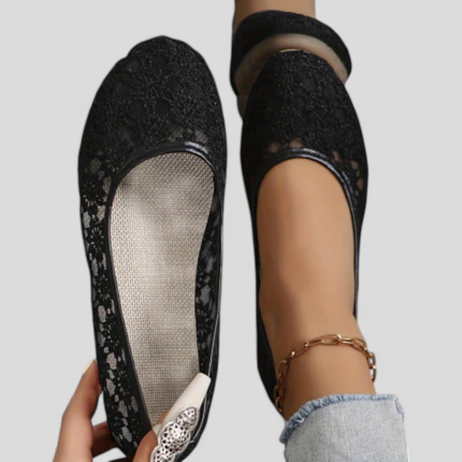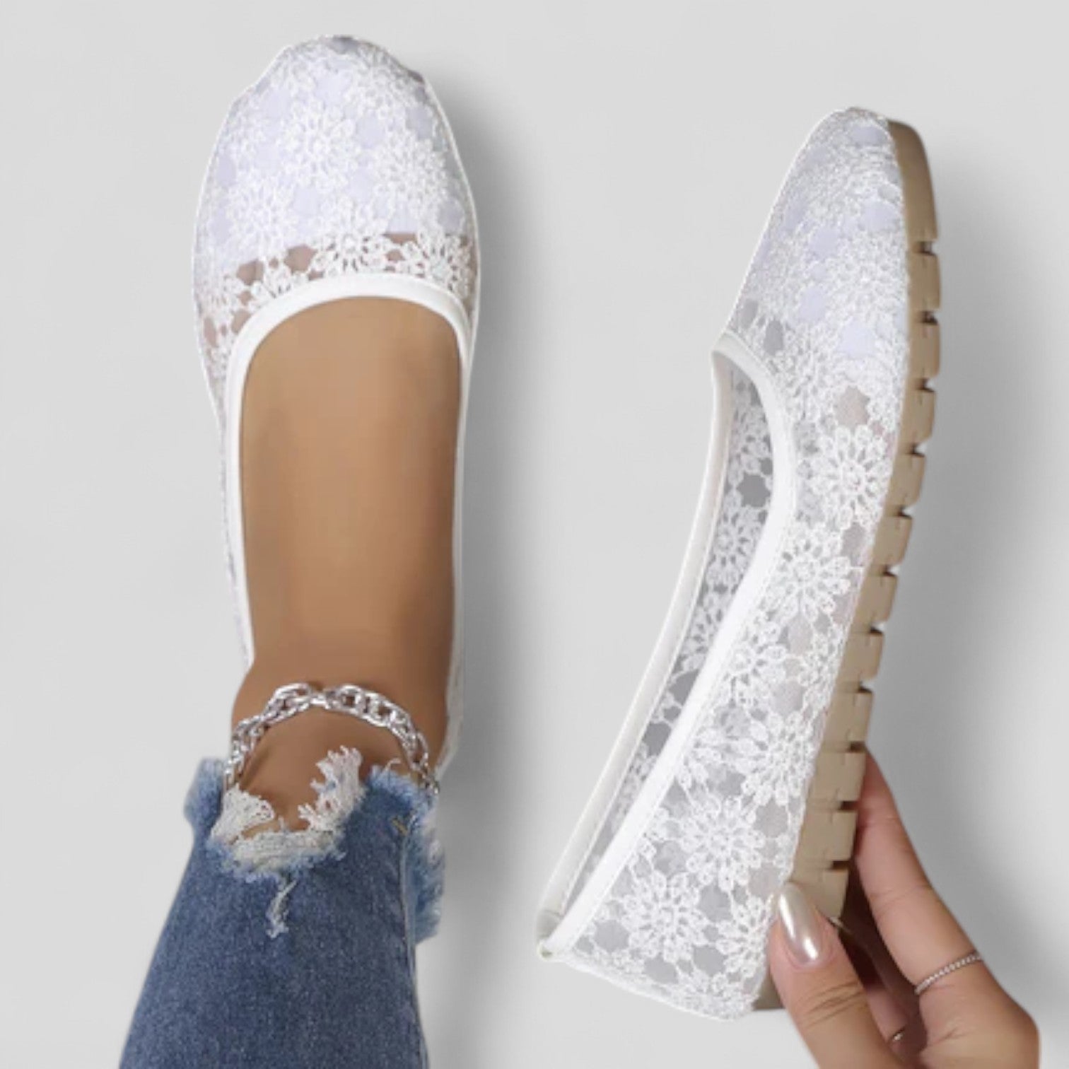 Estas delicadas bailarinas con encaje floral son femeninas, elegantes y muy cómodas. Perfectas para primavera y verano.
