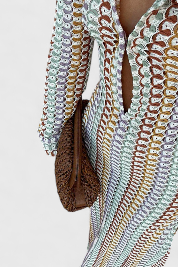Crisanta Vestido Largo Estampado con Ondas Multicolores y Manga Larga