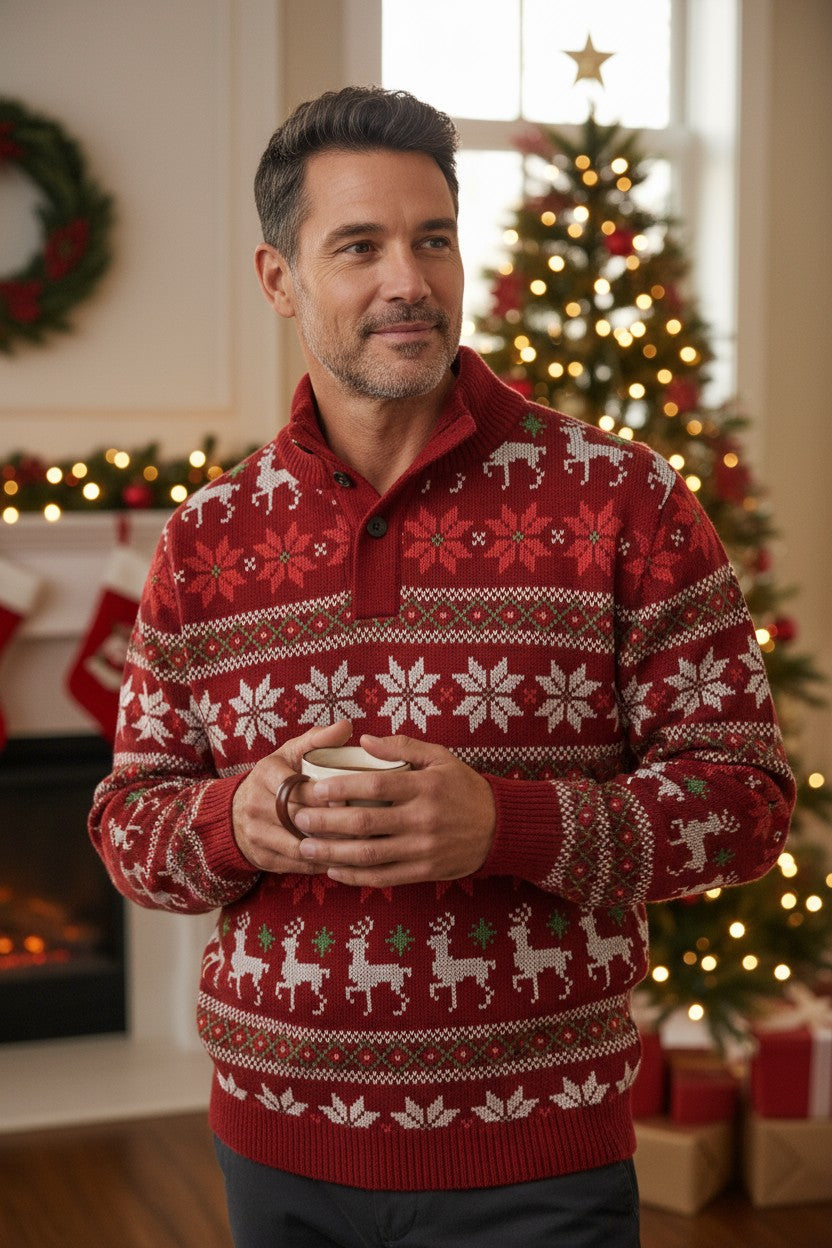 El suéter Rafaelle da vida a la magia del invierno con su clásico diseño escandinavo. El intenso color rojo se combina con patrones blancos y verdes de copos de nieve y renos para lograr un look auténtico y festivo. El cierre de botones en el cuello le da al suéter un carácter robusto y cómodo.
